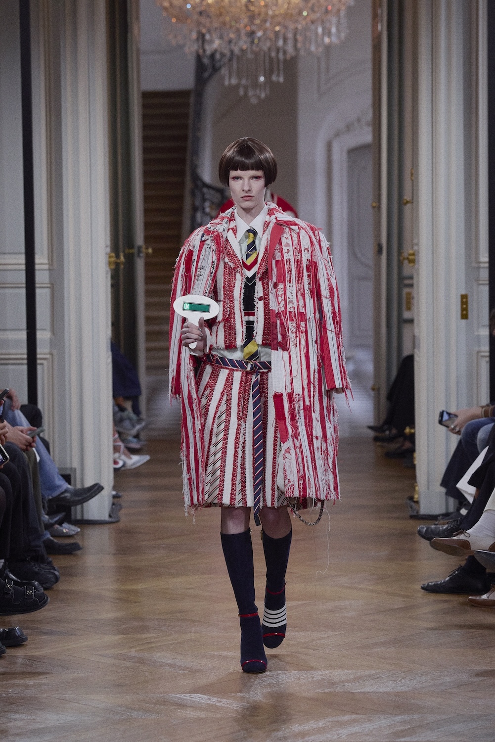 運動西裝外套突破經典,以俐落的全新輪廓呈現。肩線扭轉前傾,形似插肩袖,藉此向經典學院風與美式運動服的傳統風格致敬。硬挺的肩線顯得更加強勢,腰線內收,下擺則設計為結構化外展,創造出Thom Browne精緻剪裁正裝的全新風格。裙裝的腰線降至低腰並以腰帶束攏,褶襇柔軟地垂墜於膝上。內搭的板球針織衫則被縮裁與截短,構成全新的比例。