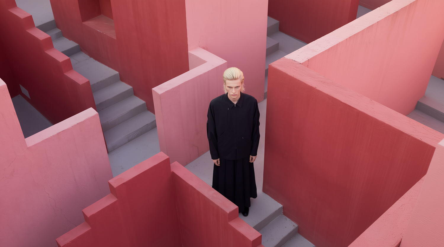 在這個純數位的虛擬環境中,服裝不再只是身體的覆蓋物,而是與建築空間相互連動的結構系統。透過多重透視的取鏡,展現了裁片接縫與空間線條產生的交錯美感,呈現出精確的結構邏輯。