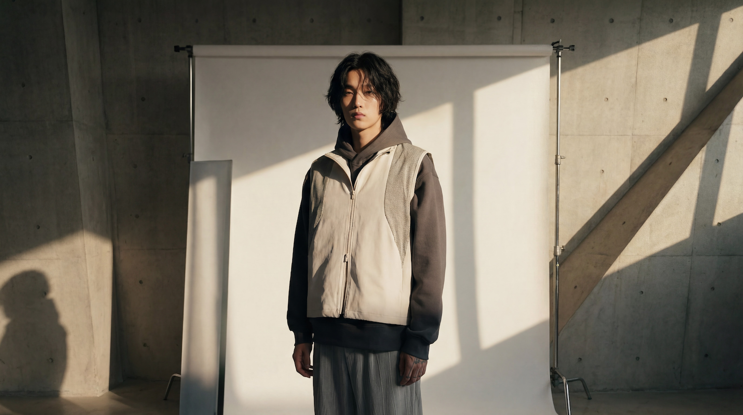 儘管發表場域不同,但兩地展出的核心技術均圍繞著Hybrid(混合)結構與流動感剪裁。oqLiq本季大量混合使用天然纖維與高性能機能面料,透過系統性的層次配置取代單純的厚度堆疊。