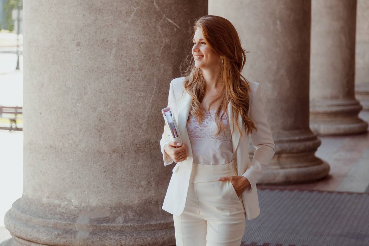 這套穿搭適合出席重要場合,像是工作會議。選擇一件剪裁俐落的白色西裝外套,搭配白色鉛筆褲,能夠展現出專業且優雅的氣質。建議選擇材質較挺的布料,如羊毛或混紡,以增加整體的質感。