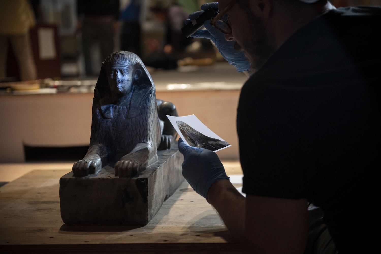 2. 〈未來的國王霍朗赫布及其妻子的雕像〉:跨越百年的考古拼圖 大英博物館早在1839年就取得此物,但當時沒有任何資料,不知道這個身分到底是誰。這個雕像交握雙手的殘件1976年在薩卡拉(在當時還是將軍的霍朗赫布陵墓裡面)被發現。直到2009年,學者才將這些線索拼湊起來,意識到它們屬於同一個雕像。凱莉說,「後來我們對手部殘件進行了石膏翻模並帶回大英博物館,它與雕像完美吻合。現在在展覽中,你也能看到這個裝在雕像上的石膏翻模。」這件展品見證了考古學是一場「永不停止的破解謎題過程」。