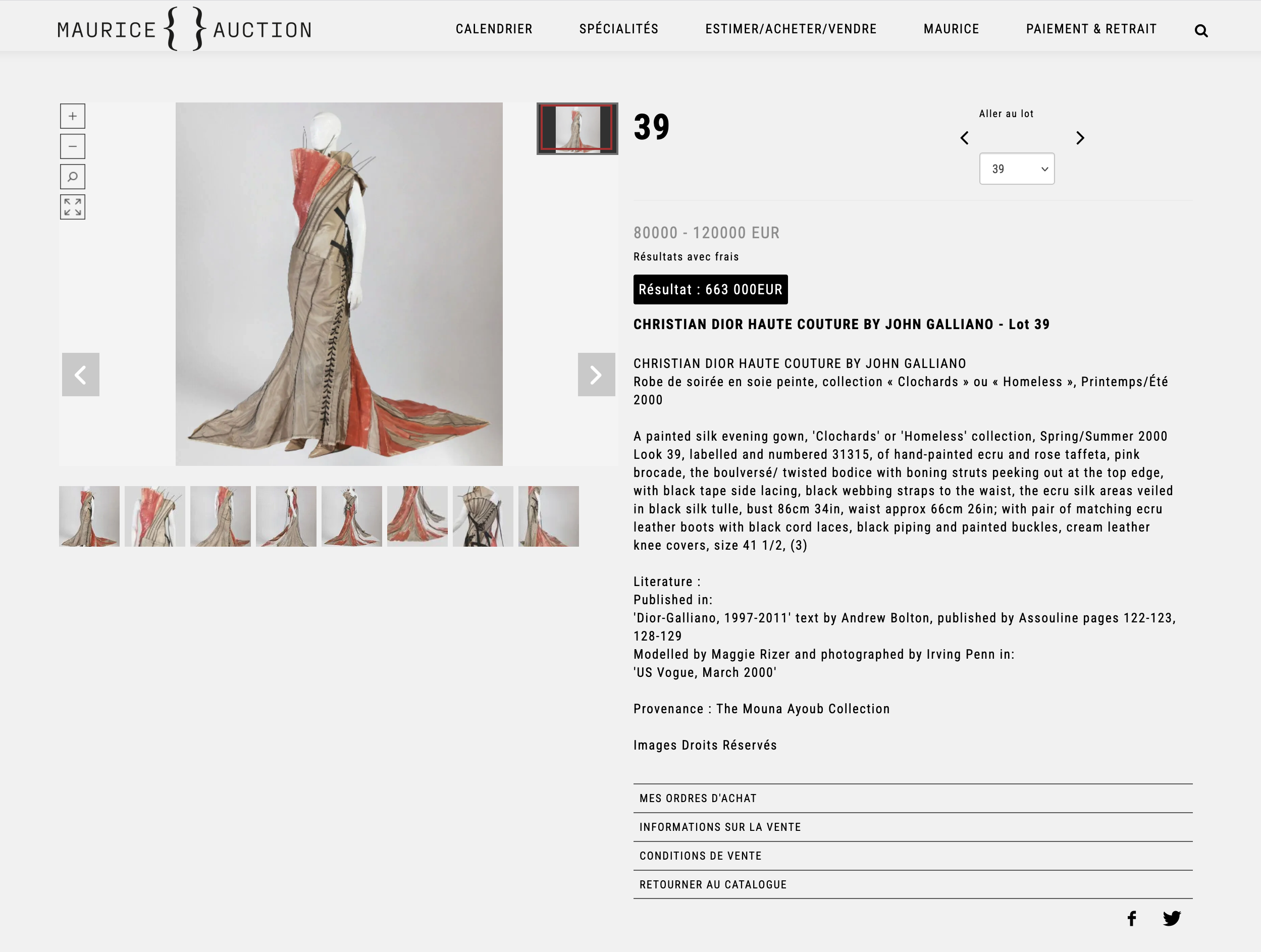 • 第一幕:Dior的華麗盛世與墜落(1996–2011) 這段時期John Galliano建立了全球性的影響力,將Christian Dior推向藝術高度。近期在Maurice Auction的拍賣會上,一件來自 2000年春夏高級訂製系列「Clochards」(遊民系列) 的編號39手繪絲綢晚禮服,創下66.3萬歐元(約76萬美金)的驚人成交價。這件禮服曾由名模Maggie Rizer演繹、攝影大師Irving Penn拍攝,是John Galliano傳奇地位的象徵。然而,2011年他因爭議言論遭品牌開除並離開主流視線,經歷了職涯最嚴重的崩塌。
