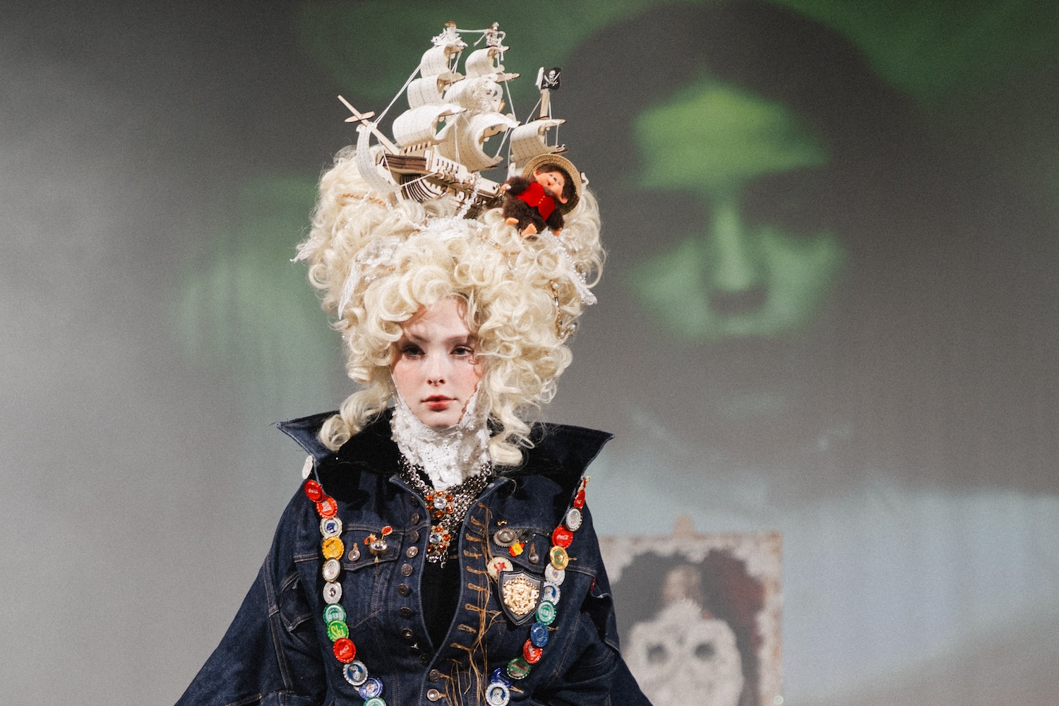 張汮宇將這份張狂重新召喚,讓金色捲髮托起精密模型船,甚至調皮地在船首安置了戴草帽的小猴子。他更巧妙利用紅髮結構,形塑出巨大的骷髏面容,讓髮型成為靈魂借身後留下的痕跡。這種「虛擬與實體」的並置也延伸至秀場感官:賓客戴上面罩進入煙霧繚繞的空間,耳邊環繞著導入AI協作的歌劇聲響,這種感官體驗與精緻、耗時的手工藝形成對比,更襯托出服裝作為實體創作的重量。
