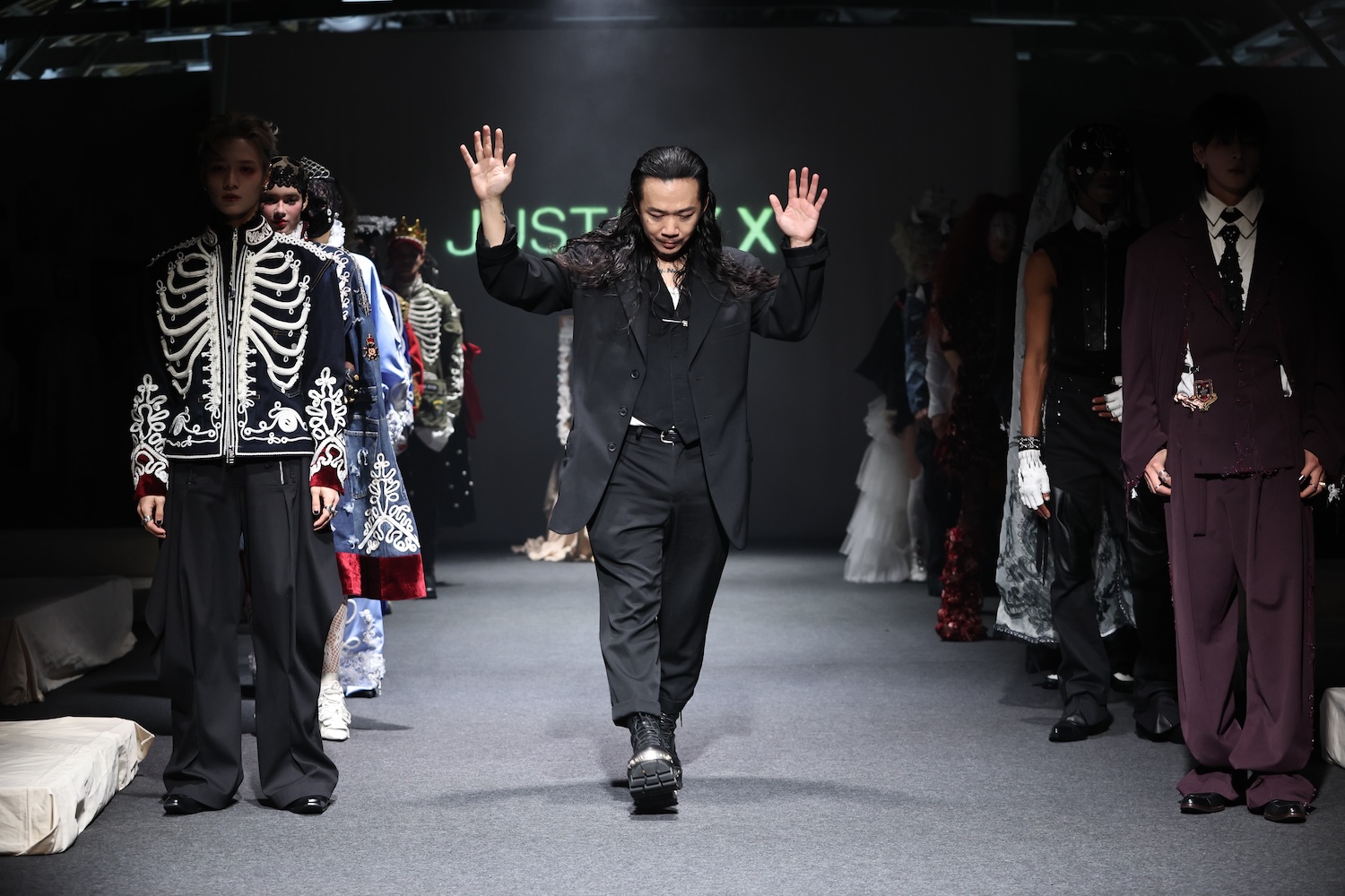 人氣男團SEVENTOEIGHT成員學駿與Dom的登場,為這場歷史韻味濃厚的秀注入了新世代偶像的能量。呼應當下街頭對於「掛飾感」的迷戀,設計師將迷你服裝、魚骨、蕾絲手槍、臂章與軍裝語彙轉化為風格標記,讓屬於收藏、歷史展示的元素,成為可以穿上街頭、走進夜晚的全新語言。