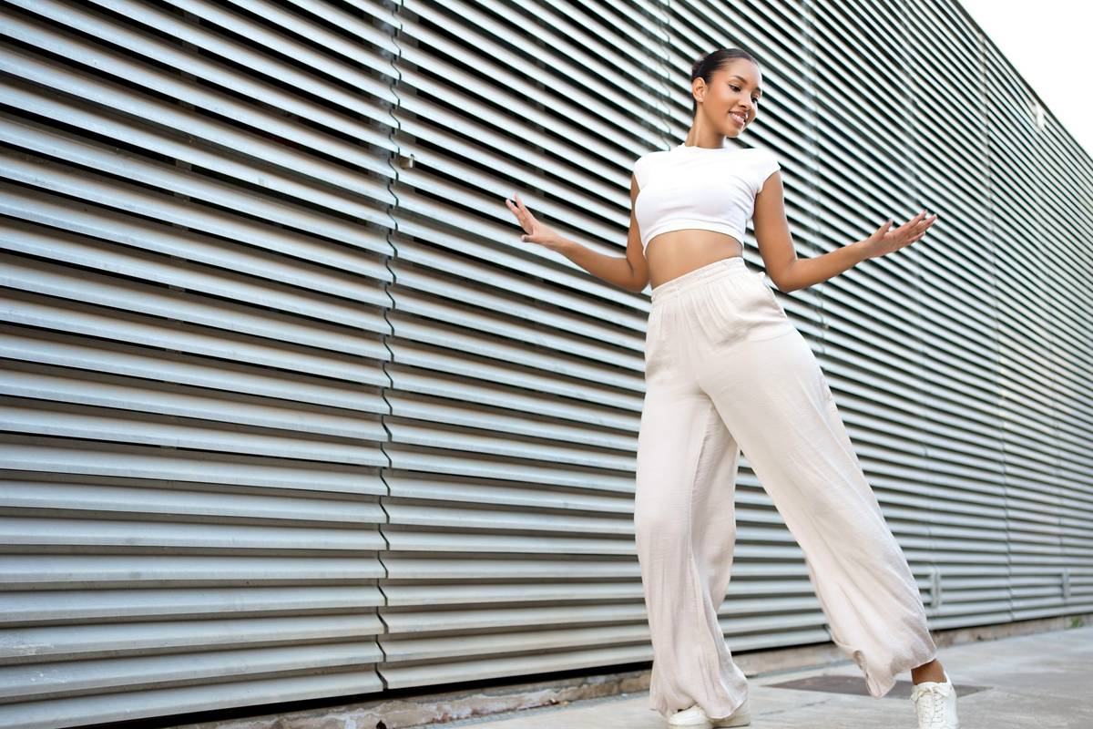 如果妳覺得素色寬褲太單調,不如試試帶有「側邊條」的運動寬褲。那兩條直挺挺的線條,在視覺上具有極強的收縮作用,能把寬闊的腿部線條橫向切斷。這種設計對梨型女孩特別友善,能將寬度「隱藏」在陰影裡。搭配一雙厚底老爹鞋,腳踝若隱若現,不僅能增高,還能讓小腿看起來像名模一樣筆直。